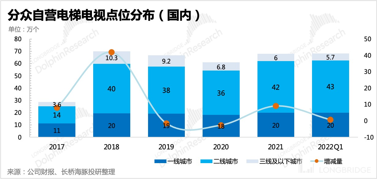 截至今年一季度,分众的自有框架媒体全国有 155 万个点位,但近几年存量已经逐年走低,其中有分众自己 18 年为了应对竞争而过度扩张后,主动选择的优化收缩,同时也有疫情的影响。除此之外,智能屏 “分众直投” 系统的推出,也分流了不少中小商家的预算。