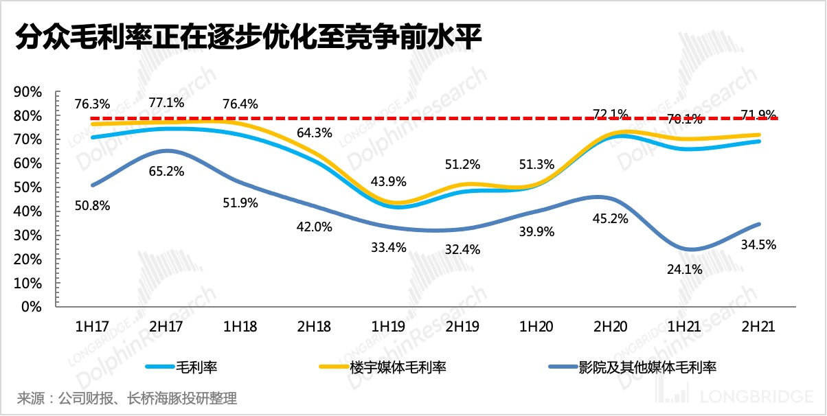 不过后续的情况我们也看到了,在疫情的催化下,对手先扛不住 “主动停战 “。此后分众转头开始优化一个个仓促占有的媒体点位(提高刊挂率、停掉低效益的点位等),与此同时,随着新消费、国货潮流的兴起,以及疫情缓和解封,分众的梯媒毛利率也逐步向恶性竞争之前的水平靠近。