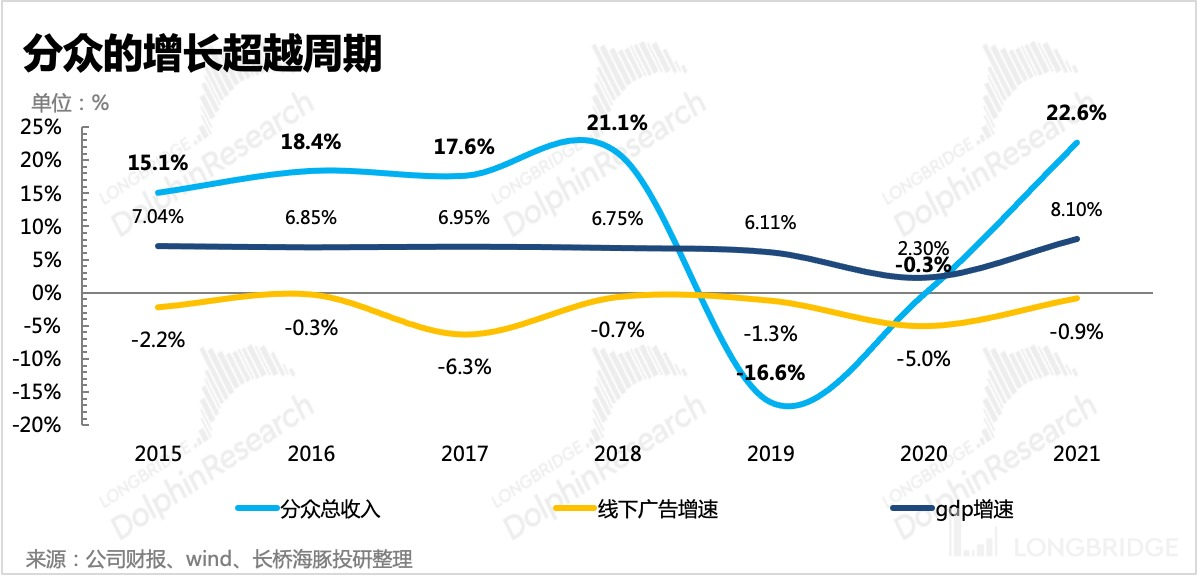 中国经济增速自 2011 年起回落到个位数增长,并且逐年压力在加大,同时分众所归属的线下广告市场,也在移动互联网浪潮中,逐渐被分去广告主的青睐,整体市场直接就是不断下滑的趋势。但同期的分众,除了 19 年恶性竞争期,其他时候的业绩均在 “蒸蒸日上”。