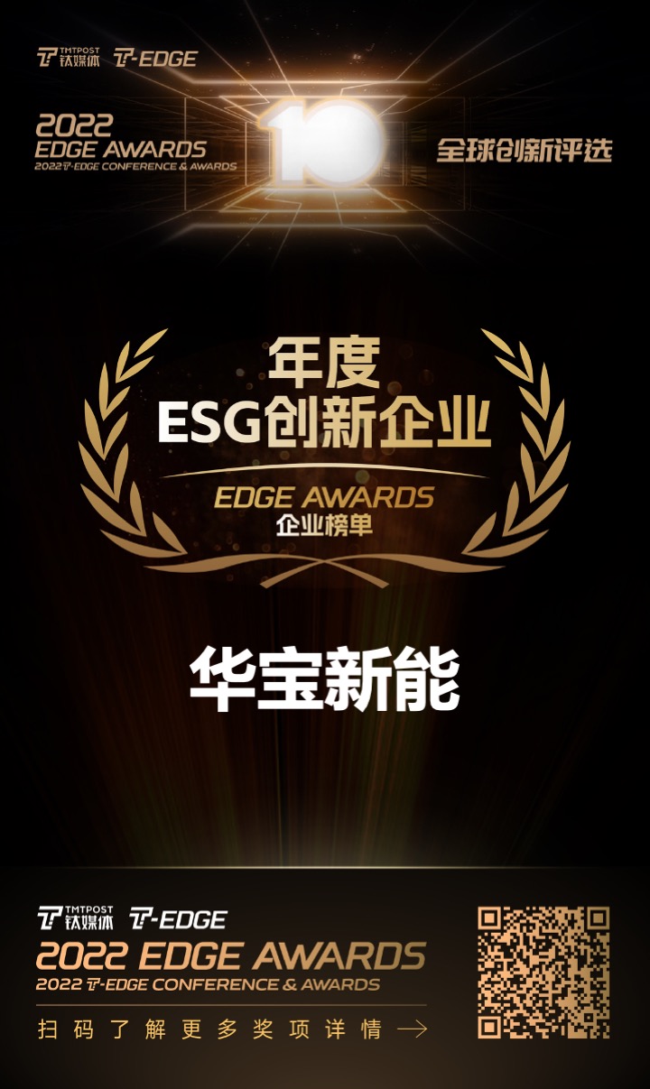 12月22日-23日,2022T-EDGE全球创新大会暨钛媒体十年致敬盛典在北京举行,期间钛媒体“十年致敬”榜单重磅揭晓,全球便携储能龙头华宝新能(301327.SZ)斩获“年度ESG创新企业奖”。