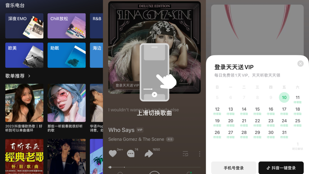 汽水音乐诞生一年不到,重心仍在低调拉新,打开抖音、西瓜视频等一系列相同体系APP中都能轻易找到汽水音乐的入口,而日常登录签到就能赠送一天会员,目前为止还是免费。