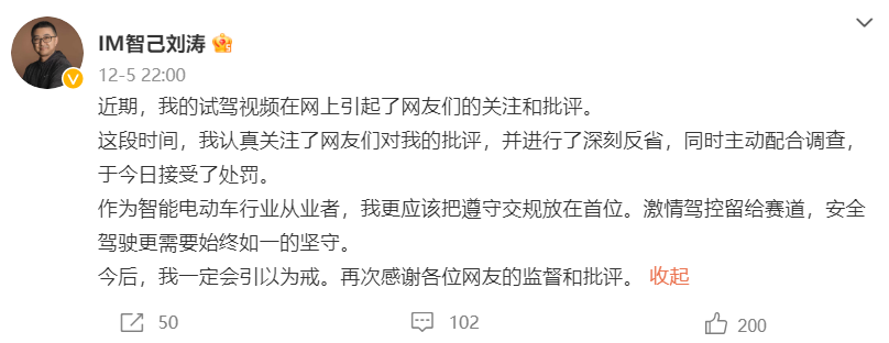 拖拖拉拉这么久,上汽智己CEO刘涛终于在微博上致歉: