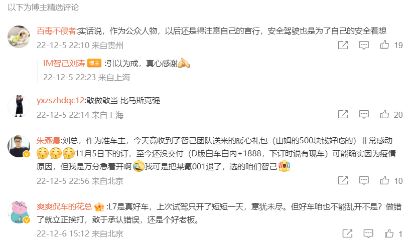 值得注意的是,在刘涛道歉帖下面的“博主精选评论”中,夹带大量智己“私货”。有评论说“敢作敢当,比马斯克强”的,有对暖心礼包表示感动的,甚至还顺带diss了同样主打性能的“极氪001”。