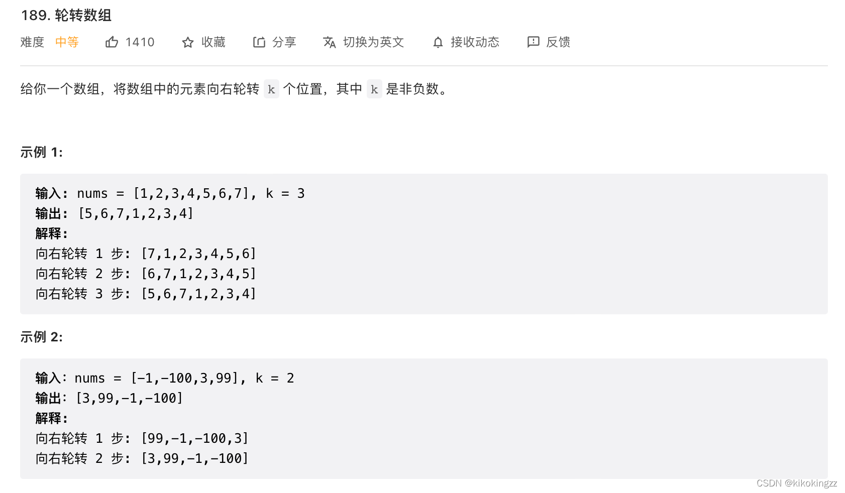 void reverse(int*a, int left , int right)//创建一个逆置函数 { while(left<right) { int tmp=a[left]; a[left]=a[right]; a[right]=tmp; ++left; --right; } } void rotate(int* nums, int numsSize, int k){ k=k%numsSize; reverse(nums,0,numsSize-k-1);//step1.逆置前n-k个 reverse(nums,numsSize-k,numsSize-1);//step2.逆置后k个 reverse(nums,0,numsSize-1);//step3.逆置整体n个 }