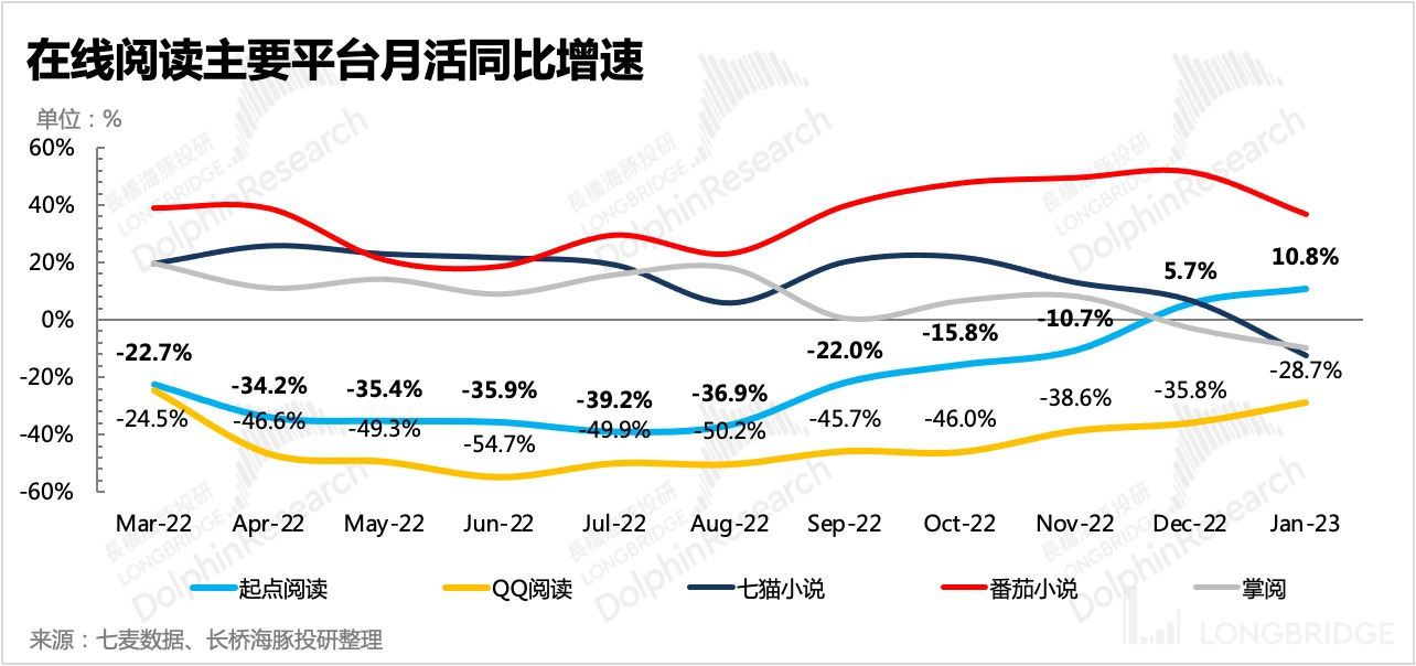 虽然对比同行,字节的番茄仍然势头凶猛,绝对值上远远甩出阅文以及腾讯系下的网文用户量,但从边际变化来看,番茄小说的增速在放缓,阅文的两款自营平台(QQ 阅读、起点)下滑幅度在逐步缩小中。而如果对比同为免费阅读的七猫小说,则已经出现了同比下降。