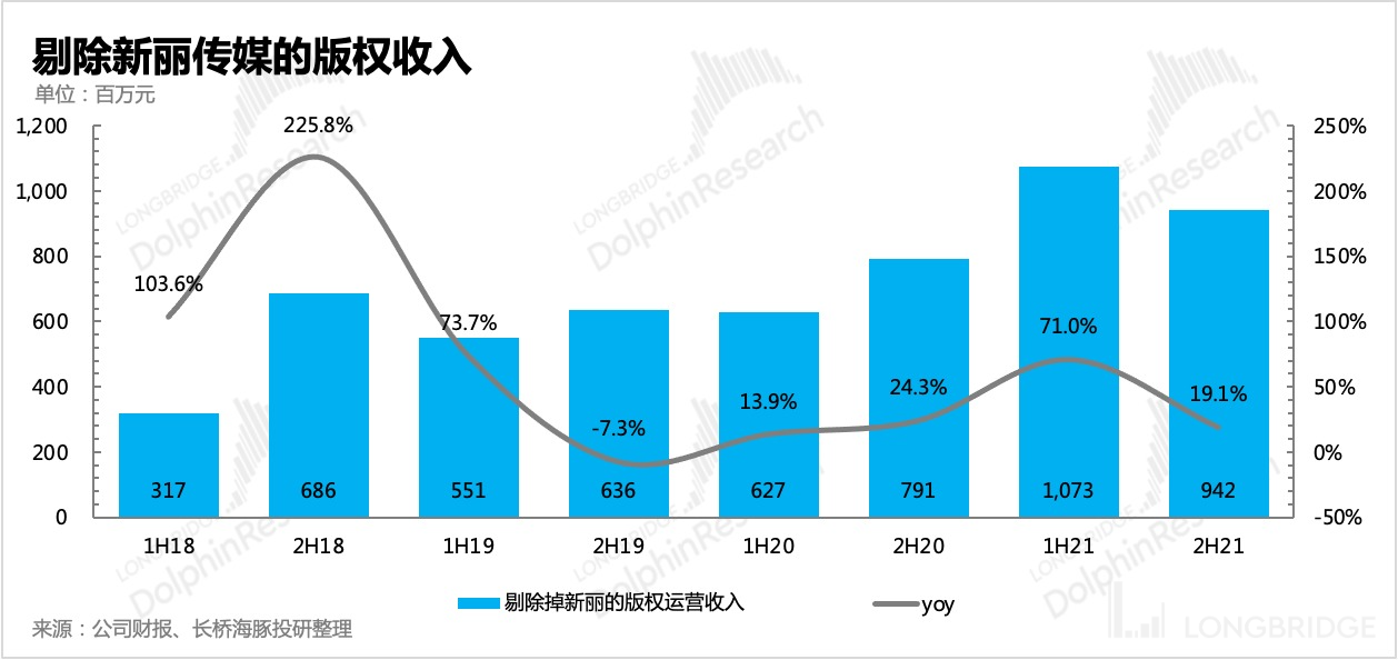 因此在剔除掉其他损益后的主营业务经营利润,下半年同比增长 15.2%,全年则有 37% 的增长。上半年盈利更优源于影视作品的集中排播,这也侧面说明新丽对阅文短期业绩的影响。