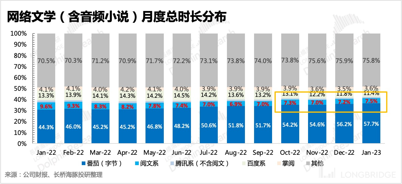 再来看时长分布情况,海豚君按照派系进行了分类统计后发现,在整个传统网文和有声小说的大盘子里,阅文系的比重从去年 10 月起开始出现了停止下滑甚至回暖的趋势。从其他主要平台的占比变化来看,阅文可能吃掉的是掌阅、百度系(七猫、百度阅读)的份额。
