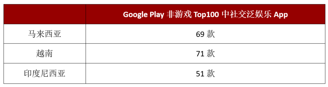根据 Data.ai 数据,马来西亚和越南的 Google Play 非游戏应用畅销榜单 Top100 中,社交&泛娱乐 App 的占比达到了 70% 左右,印尼占比 50% 左右。
