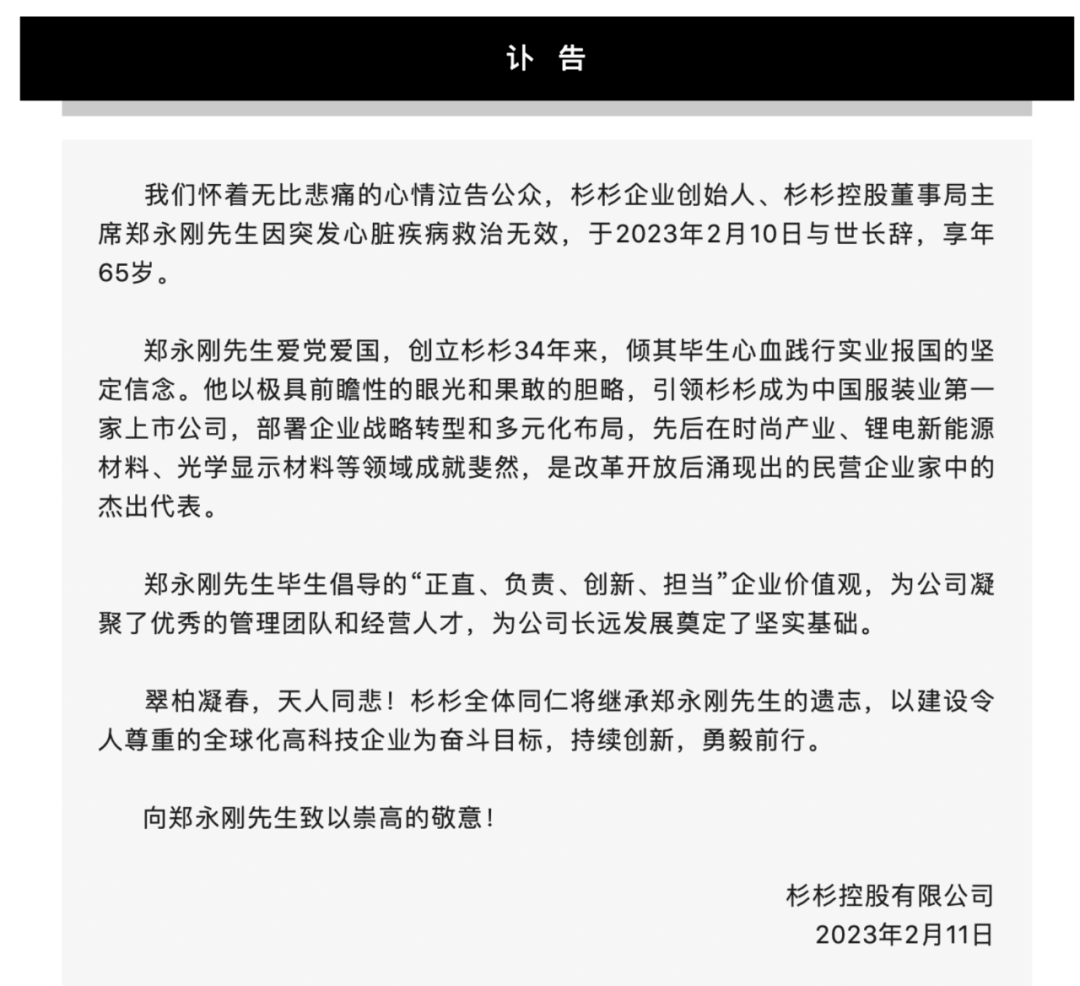 一代风云浙商落幕。2月11日,杉杉控股有限公司官方网站发布讣告,杉杉企业创始人、杉杉控股董事局主席郑永刚在2月10日因突发心脏疾病去世,享年65岁。杉杉官网也在当日变成黑白颜色以示悼念。