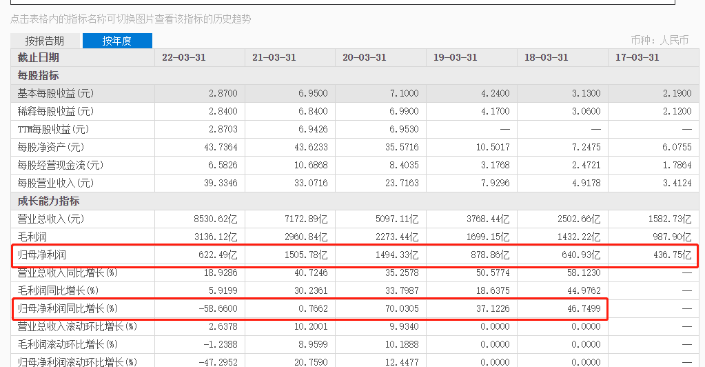 据财报显示,阿里在2022财年增收不增利,全财年(2021.4.31--2022.3.30)总营收8530.62亿元,同比增长19%,看似增长不错,但归母净利润却下滑了59%,622.49亿元的净利润相比上一财年的1505.78亿元减少了883.29亿元。而622.49亿元的归母净利润创下了近5年新低,近6年内也仅高于2017财年的436.75亿元,比2018财年的640.93亿元还低了18.44亿元,阿里辛苦五年,一朝回到五年前。