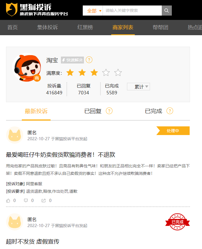 而部分消费者在直播中买到的产品远低于心理预期,就会产生对平台的不信任,导致平台的品牌影响力受损,也会出现数量庞大的消费维权事件,黑猫投诉平台显示,淘宝累计投诉量已近42万件,仅次于以“低价和山寨”著称的拼多多。