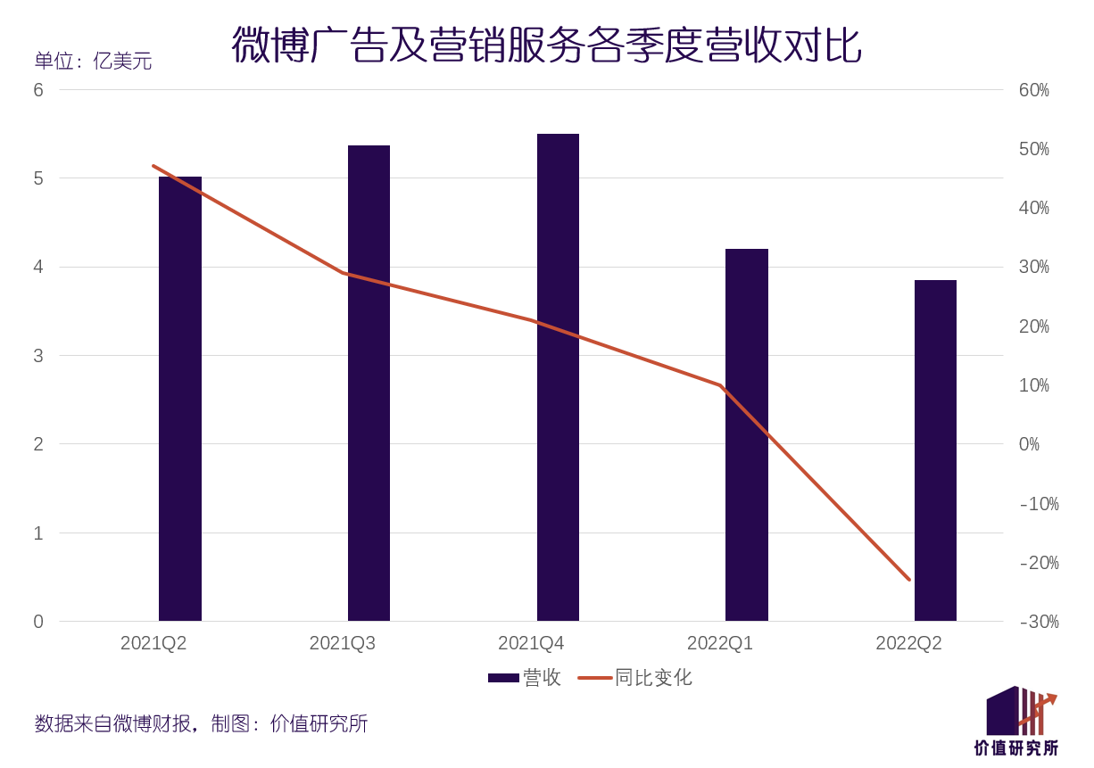 微博目前的营收主要来自两个板块:广告及营销服务、增值服务,前者营收占比长期接近90%,是最主要的营收支柱。但在二季度,这根支柱变得摇摇欲坠。