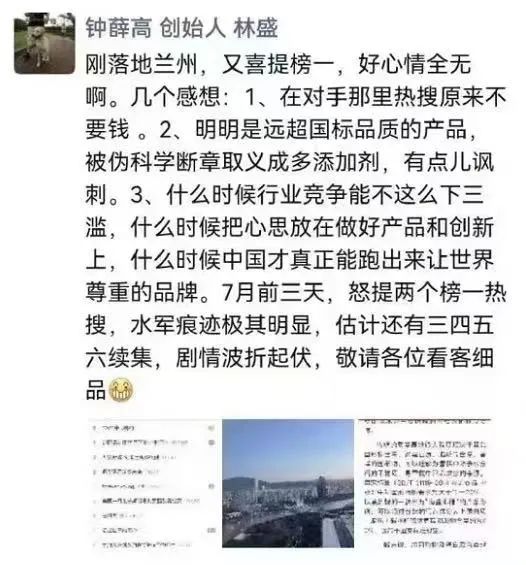 7月5日,有媒体曝出钟薛高创始人林盛的朋友圈截图,他对最近“喜提榜一”的感想是,“明明是远超国标品质的产品,被伪科学断章取义成多添加剂”,并认为这几个热搜“水军痕迹明显”。