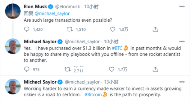 2020年底,马斯克开始对比特币下手。时年12月20日,马斯克在推特上询问数字货币的重要推动者迈克尔·塞勒“将特斯拉公司资产负债表的”大笔交易“转换为比特币的可能性。”