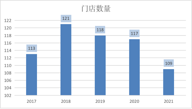 全聚德的主营业务包括餐饮服务及食品加工、销售两部分,报告期内收入分别为7.0亿元和2.3亿元,占比分别为73.8%、24.0%,以餐饮业务为主要收入来源。2021年两项业务收入增长率分别为32.2%和-4.3%,虽然餐饮业务收入同比有所增长,然而仔细观察,不管从门店数量还是营收方面来看,其实都表现较为惨淡。