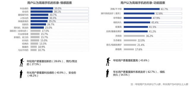 这份报告也提及了消费者对高端手机的形象认知,其中情感因素上,科技感的、安全的是消费者最看重的两点,而功能因素上,流畅/不卡顿、操作系统友好(易用)最为重要。从这些因素来看,华为给消费者突出的高端形象是科技感、创新以及信号稳定、配置高,苹果则更符合安全、保值度高、重视细节以及流畅/不卡顿、操作系统友好(易用)等。