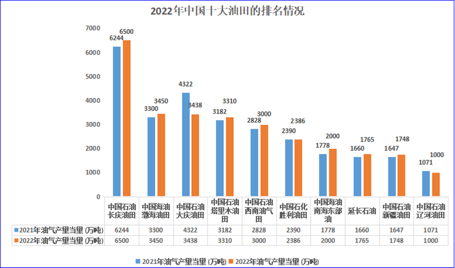 华夏能源网统计,2022年油气产量当量排名依次为长庆油田、渤海油田、大庆油田、塔里木油田、西南油气田、胜利油田、南海东部油田、延长石油、新疆油田、辽河油田,分别为6500万吨、3450万吨、3438万吨、3310万吨、3000万吨、2386万吨、2000万吨、1765万吨、1748万吨、1000万吨。