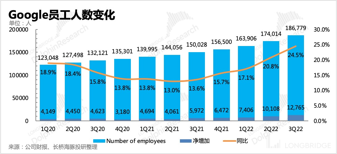 类似这样的利润压力,Google 也有。但 Google 的问题没有 Meta 那么棘手,主要来源于在疫情红利期高速扩张的团队,没有及时进行优化。而三季度环比净增的员工数还在创新高,说好的冻结招聘呢?