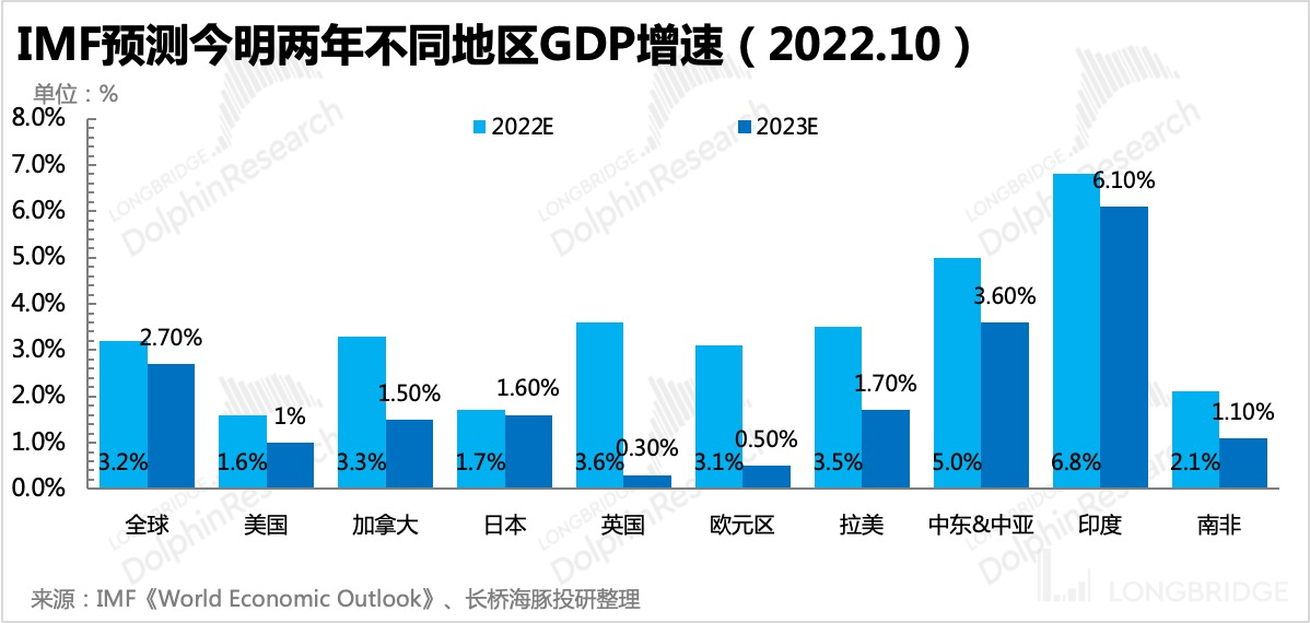 今年的经济放缓铁板钉钉,IMF 从年初至今,每隔一季度给出的 GDP 预测也是一路下调,而明年的情况则更是个大麻烦(普遍较今年显著放缓)。