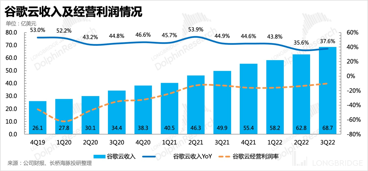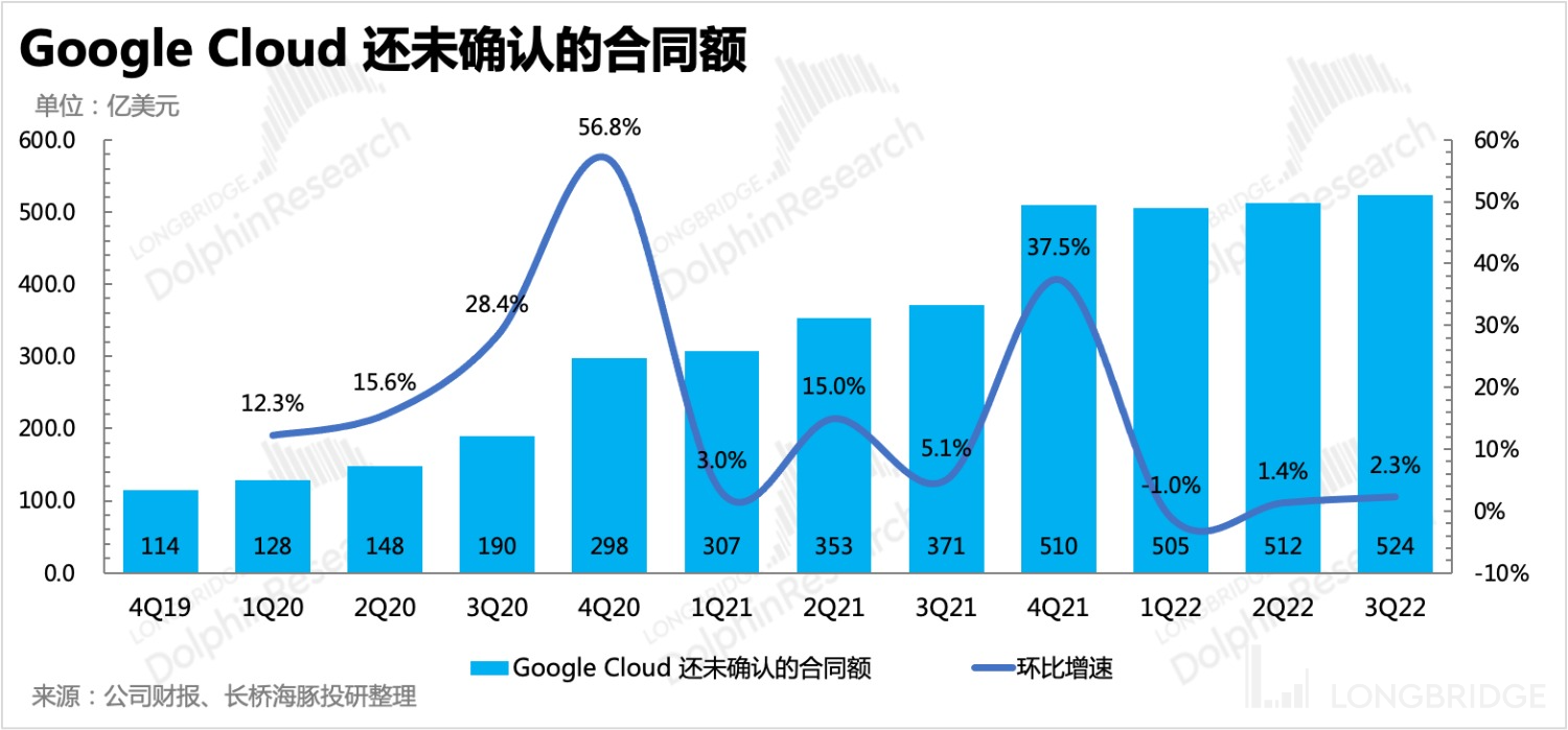相比于 Meta,Google 的第二条腿——谷歌云业务,也看起来更有希望在短期内看到利润拐点。截至三季度末,谷歌云的存量合同额(Remaining Performance obligations,主要为云业务)还有 524 亿,在去年四季度拿了几个大客户的长期大单后,家里余粮充足。