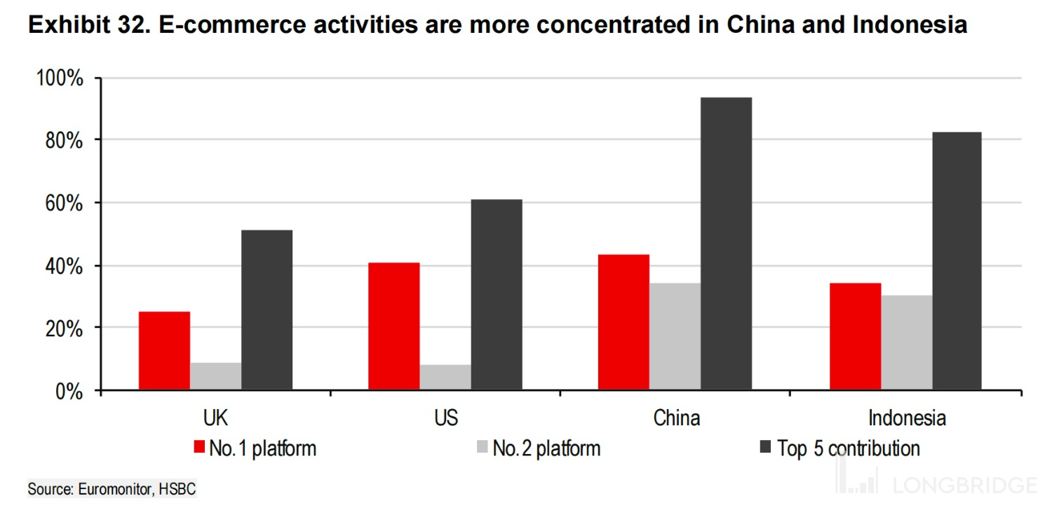 比如在美国地区,除了亚马逊一家独大以外,Top5 电商市占率在 60% 出头。但中国大陆地区 Top5 市占率高达 80%。这也导致,商家广告从社交媒体向电商平台迁移的速度不会如中国市场那么快,无论对转化率的要求有多苛刻,品牌商还是需要拨点广告预算在流量庞大的社交媒体上。