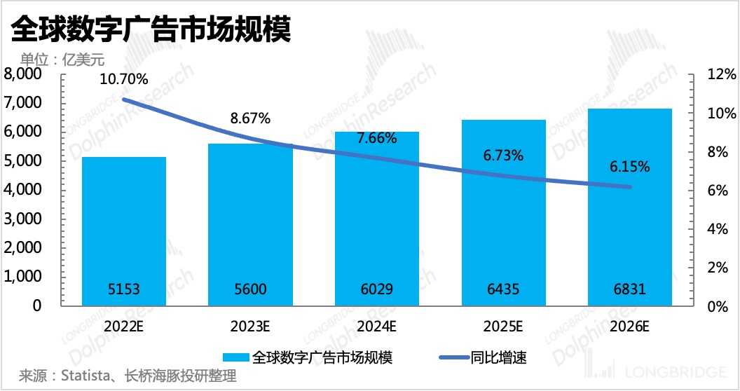 (1)市场规模:整体参考 Statista 最新的数字广告市场预测,进一步调低宏观经济的增长预期,但与此同时短视频市场的蓬勃有助于进一步加快互联网广告在整体广告中的渗透速度。最终两因素影响部分抵消,整体行业市场增速略有下滑。