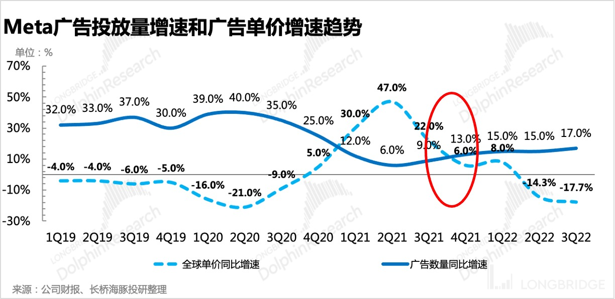 2)2021 年 Q4,Meta、Snap 因苹果 ATT 带来的负面影响越来越重,但谷歌的搜索广告却因此而受益,增速环比降幅在三方中最小。但从广告量价关系来看, Meta 的下行趋势已经有所迹象(除了公司本身的指引暴雷外):四季度 Meta 的广告报价优势开始锐减,支撑收入增长需要靠释放更多的广告库存。