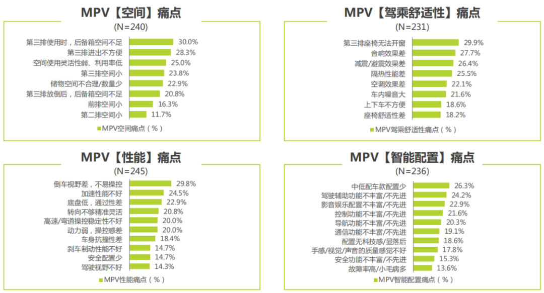 按照艾瑞咨询在今年4月发布的《中国家用MPV市场洞察报告》显示,消费者对于目前传统MPV的空间表现并不满意。根据数据显示,在240人的样本中有30%的消费者认为后备箱空间不足、23.8%的消费者认为第三排空间小。