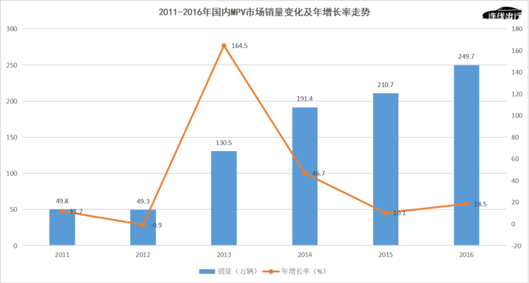 在这样热闹的行业背景下,国内MPV市场自2011年开始加速发展,到2016年这一市场的销量规模已经达到了249.7万辆,相比于2011年的49.8万辆增长了401%。