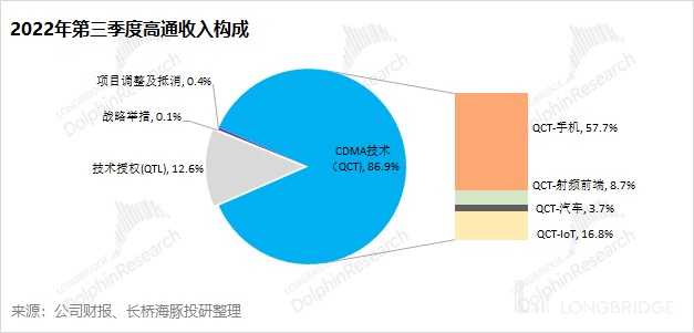 ①射频业务(QCT):业务占比在 10% 左右,主要有 4G、5G sub-6 和 5G 毫米波的射频产品。随着 5G 渗透率不断走高,5G 带来的增益影响减弱。而受整体手机市场低迷的影响,射频业务出现明显下滑。海豚君认为在新通信技术出现之前,射频业务受整体手机市场增速的影响;
