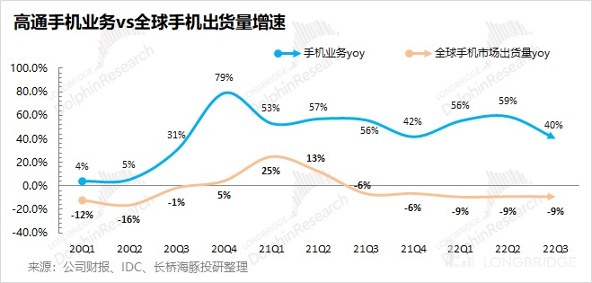 但当我们把高通手机业务和全球手机市场的表现放到一起,发现两者的增速有较大的差异性。比如在 2021 年下半年,全球手机出货量已经出现了下滑,而高通的手机业务仍出现了 40% 以上的高增长。因此,高通手机业务和全球手机市场出货量有一定关系,但相关度并没特别高。