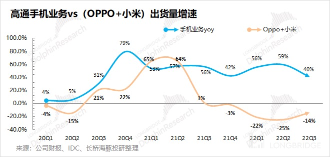 由于高通下游客户主要是安卓厂商,那么来看看安卓手机出货量和高通手机业务的相关性?海豚君依据 OPPO 和小米的全球出货量情况,来看高通手机业务的相关性。其中可以看到,由于 H 厂商的限制,在 2021 年上半年 OPPO 和小米两家出货量增速达到 60% 以上。而高通手机业务 50% 以上的高增长,也是从 2020 年末开始。