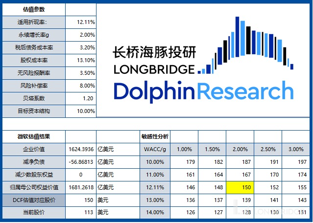 结合前文的业绩测算情况,主要从公司未来现金流角度去思考估值。在 WACC=12.11%,永续增长率 g=2% 的假设下,通过敏感性分析高通在 DCF 估值下对应 150 美元/股,较当前公司股价仍有 33% 的空间。