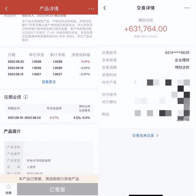 一直到最后两个月,美洋买的理财产品又逐渐调回了一些,直到到期,最终有1764元的收益,收益率0.27%,“我以前买的银行理财,最终收益都和业绩比较基准接近,但这次和4%-5%的业绩比较基准相差甚远。”