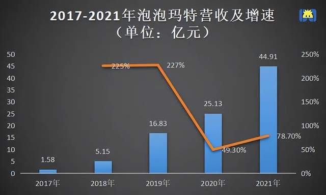 2022年上半年,泡泡玛特营收增速为33.05%,同比降幅达83.75%。拉长到年度来看,如下图所示,2021年,泡泡玛特总营收为44.9亿元,同比增长78.7%。对比之下,2018年和2019年的营收增速分别为225%、227%,2020年出现大幅下滑,2021年虽有所回升,但还远远没恢复到以前的水平。