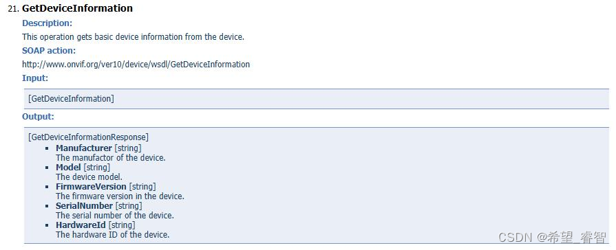 Onvif接口规范基于Web Services技术,使用SOAP协议进行服务端与客户端的数据交互。每个模块的接口都有相对应的WSDL文档进行描述,并提供了标准化的网络开放式接口,官网链接地址为:https://www.onvif.org/profiles/specifications/。以GetDeviceInformation接口为例,其描述可参考下图。