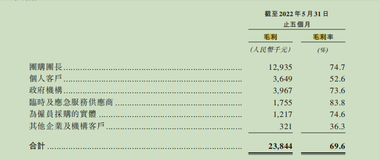 各客户群体的毛利率水平却参差不齐,差距很大。截止2022年5月末,乓乓响的各客户群体中,临时及应急服务供应商的毛利率最高,为83.8%;团购团长毛利率74.7%、为雇员采购的实体、政府机构毛利率分别为74.6%、73.6%;而个人客户以及其他企业及机构客户的采购毛利率分别为52.6%、36.3%。