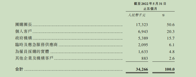 钛媒体APP注意到,2022年前五个月,临时及应急服务客户项下,团购团长贡献了一半以上的营收,达1732.3万元;同期来自个人客户、政府机构的收入分别约694.3万元、538.9万元,占比分别为20.3%、15.7%。