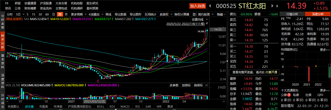 更值得关注的是,尽管屡次触碰监管红线,ST红太阳在二级市场上却备受追捧。数据显示,其股价从2021年7月9日3.83元已经涨至今年7月8日的14.39元,累计涨幅高达275.72%。(本文首发钛媒体,作者|于莹)
