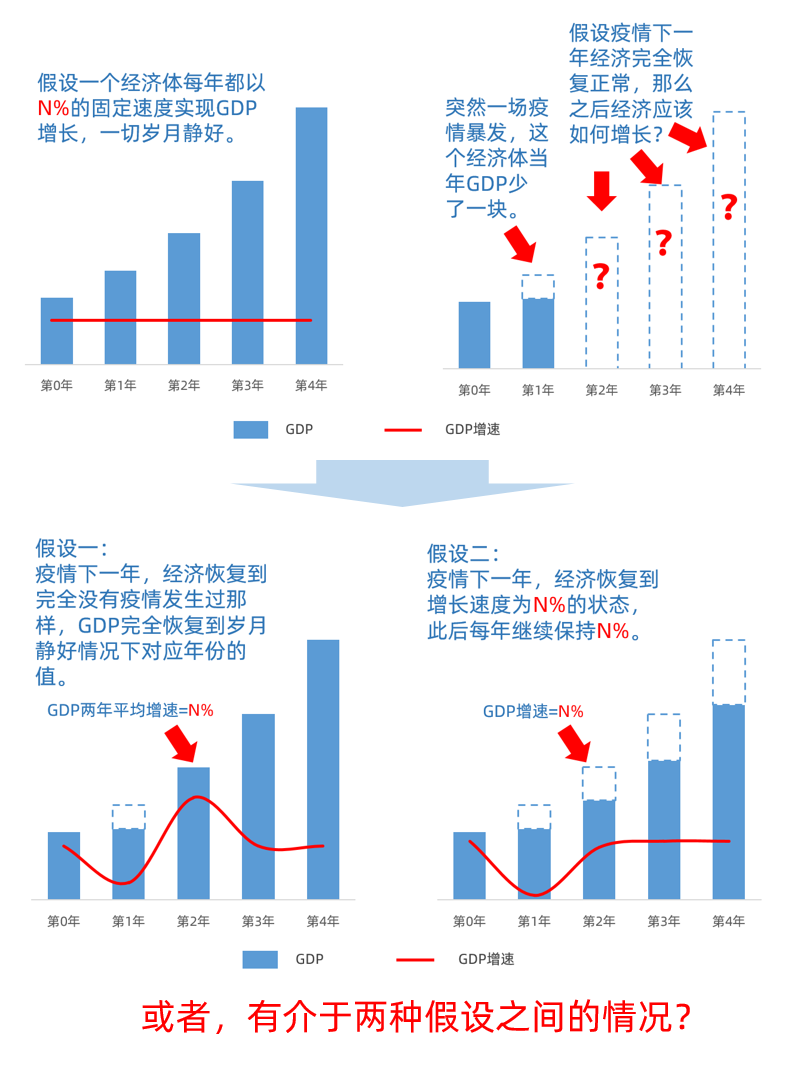 所以这就可以帮助理解两年平均增速的含义,通俗来说,如果我们要求在疫情的下一年,两年平均增速能够恢复到稳态路径下原有的潜在增长率,就是相当于在有疫情的平行宇宙中,当疫情过去后,整个国家的状态与没有疫情的平行宇宙的状态“几乎”重合!