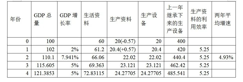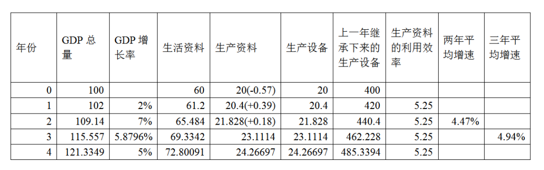 上面的表格中,第0年的生产资料,有0.57放入库存中而没有参与疫情年的生产,故标记“(-0.57)”,而在第2年的生产中会重新利用起来,故标记“(+0.57)”。经过这种调整,消耗性生产资料的利用效率就始终在5.25。