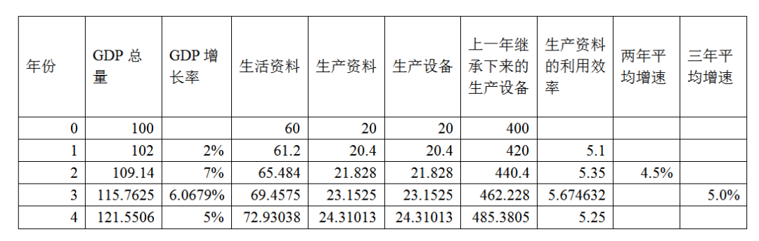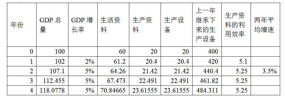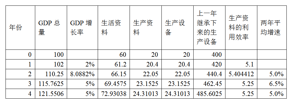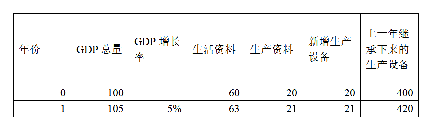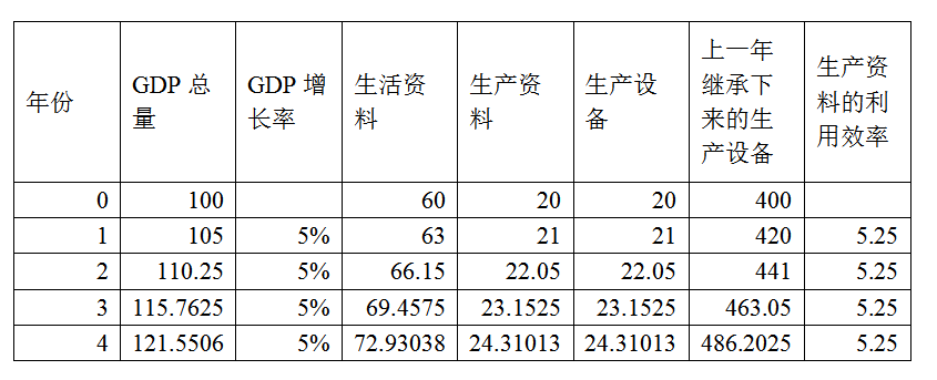 我们发现在整体经济增长了5%之后,GDP变为了105元,生活资料、生产资料、新增生产设备分别变成了63、21、21元,也都增长了5%,然后上一年继承下来的生产设备,需要加上第0年新增的20,于是变成了400+20=420,恰好增长率也是5%。