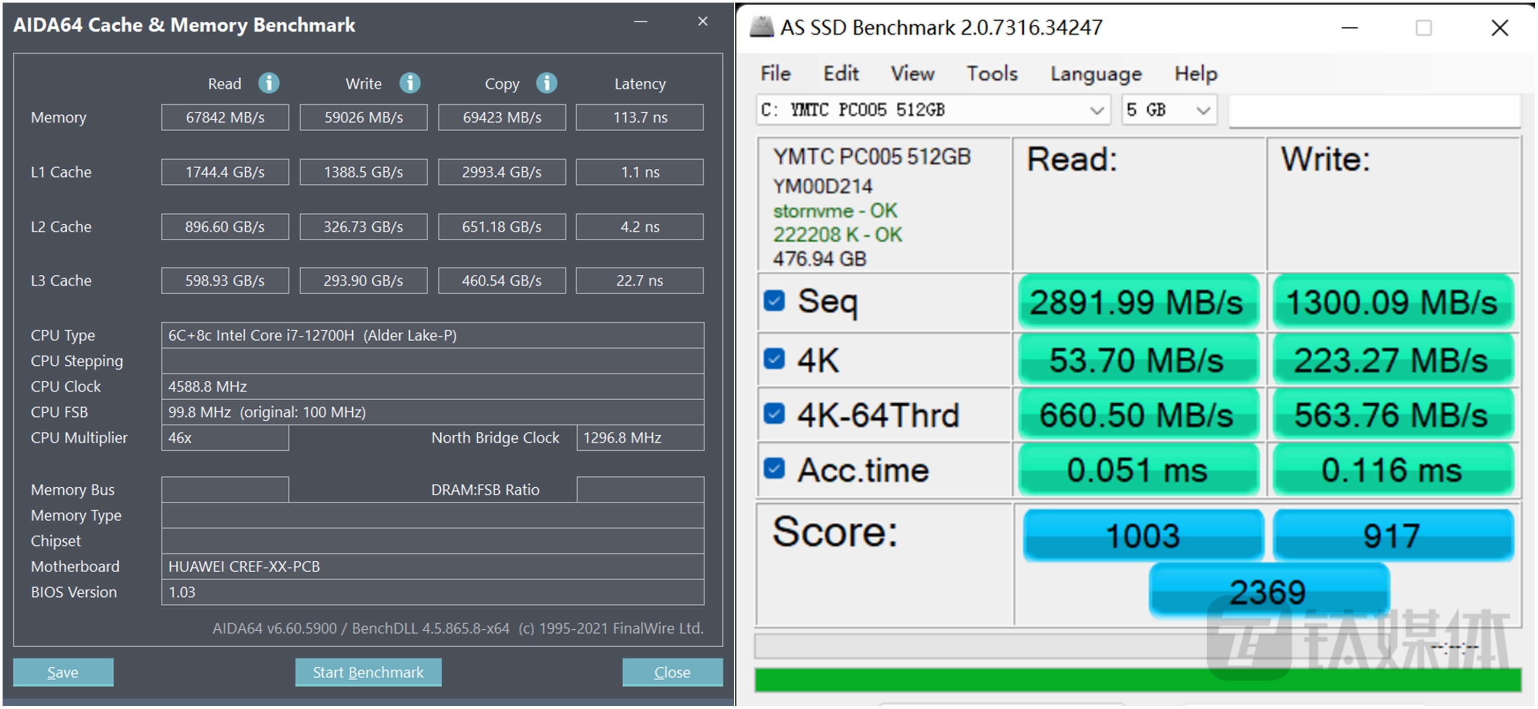另外, 笔者也单独对内存和硬盘进行了测试,内存得益于LPDDR5的高规格和不错的频率加持,读写速度可以算是目前笔记本产品中的第一梯队水平,硬盘方面在ASSD 5GB读写的测试当中,1300MB/s的写入速度只能算中规中矩,如果能够升级到PCIE4.0规格的硬盘就更好了。