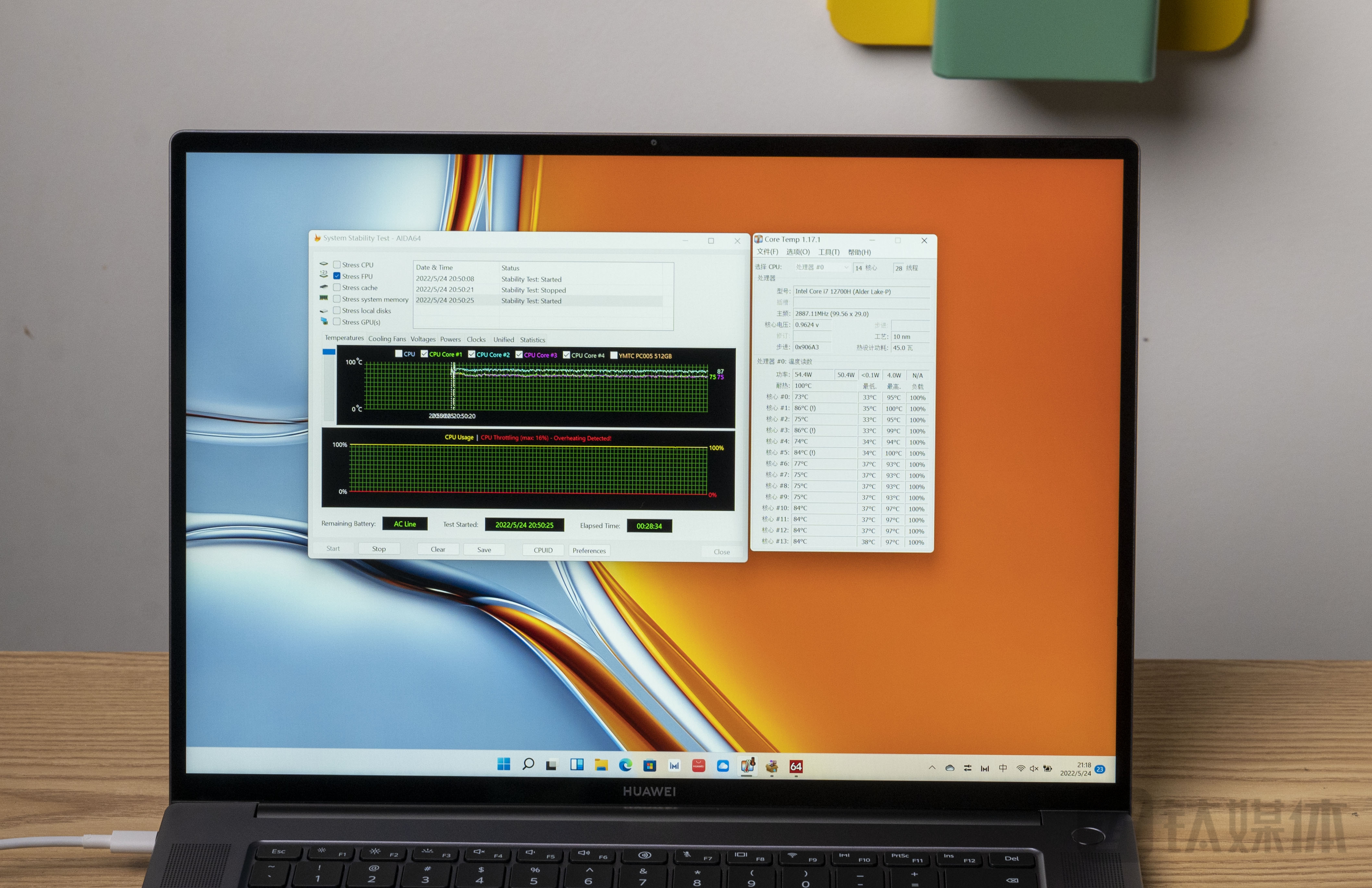 除了性能方面,笔者也进行了烤机测试,在AIDA64满负载运行超过20分钟以后,可以看到CPU性能核心温度稳定控制在85℃左右、效率核心温度则在75℃左右,此时通过Fn+P开启高性能模式的CPU输出功率可以持续在53~55W之间,可见这款产品的散热能力确实非常强悍。