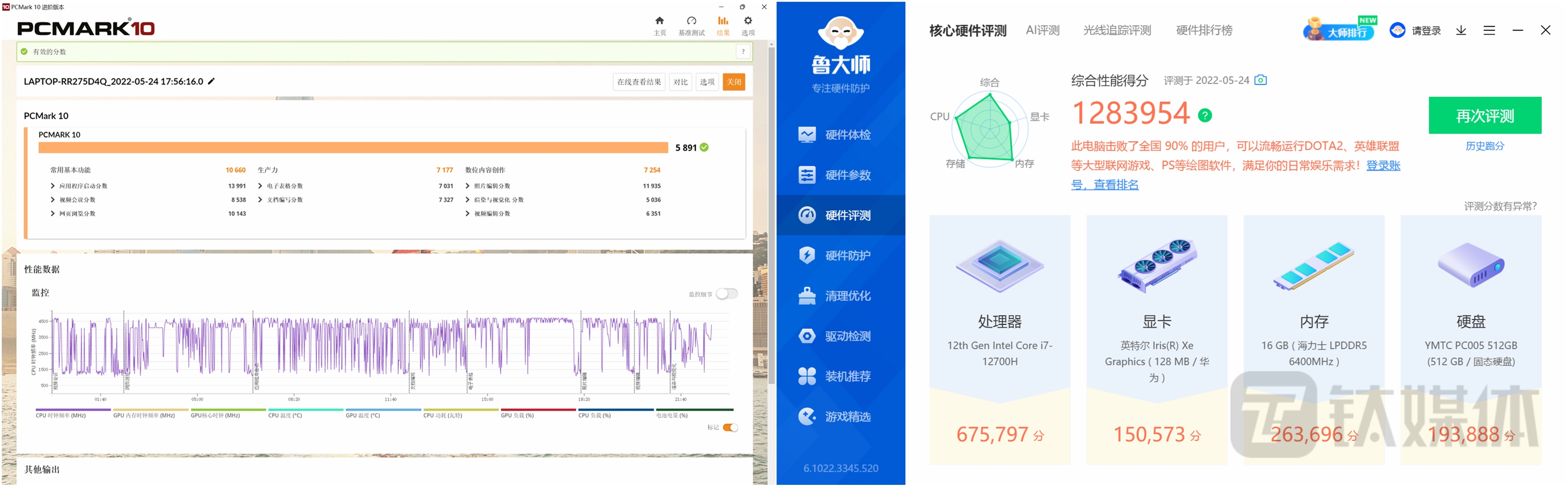 整机的跑分方面,这里分辨使用了PC mark10以及鲁大师,可以看到整机的配置相对而言算是轻薄本当中比较均衡的,5891的PC mark10最终得分对于一款主打生产力场景的笔记本而言属于很高的分数了,整机得分也来到了1283954分。