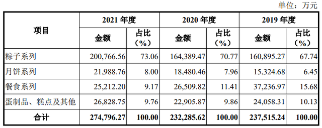 招股书显示,从2019年到2021年,五芳斋产品中粽子系列占比分别为67.74%、70.77%和73.06%,对粽子的依赖不减反增。可以说,五芳斋的业绩几乎是靠卖粽子撑起来的,多年如此。