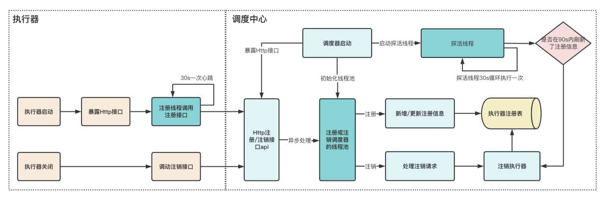 - 执行器在暴露了调度接口后,将自己的ip和端口信息通过调度中心的注册接口注册到调度中心,同时每30s进行一次心跳,用于更新自己的注册信息。
