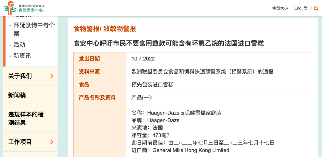 值得注意的是,就在不久前,中国台湾地区“食药署”发布查验不合格食品名单,其中同样是法国出口的两批次哈根达斯香草冰淇淋被检出环氧乙烷,1164盒、5471.34公斤的产品被拦在边境。同期,新加坡卫生部也宣布,一个特定批次的哈根达斯冰淇淋被撤出市场。此外,澳大利亚也开始召回同款来自法国的哈根达斯香草冰淇淋。