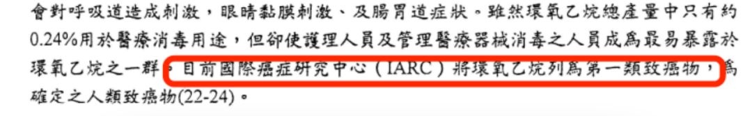 据了解,环氧乙烷是除害虫剂,包括毒杀昆虫及老鼠,对人体有毒,其后发现具致癌性,有可能导致呕吐、恶心、腹泻、头痛、晕眩、呼吸困难等症状,甚至可能损肝、肾及出现昏迷,严重或导致死亡。世界卫生组织国际癌症研究机构已将环氧乙烷列为一级致癌物,若长期接触,会增加罹患血癌、乳癌之风险。